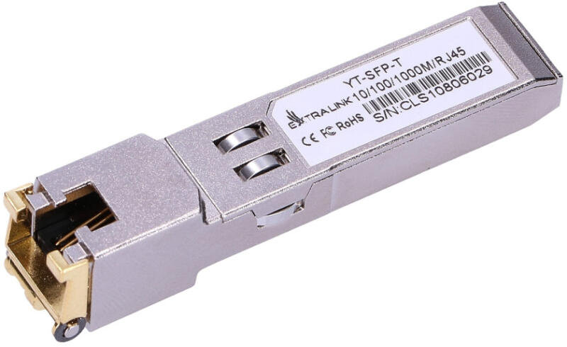Extralink's cost-effective SFP RJ45 1.25G 100M module The Extralink SFP RJ45 module with a throughput of 1000 Mb/s is a powerful and cost-effective device that complies with Gigabit Ethernet and 1000-BASE-T standards defined by IEEE 802. 3-2002 and IEEE 802.3ab. The SFP RJ45 cartridge supports a data rate of 1000 Mbps at to 100 meters for Category 5 Ethernet cable and a 1000 Mbps full duplex data link with 5-level pulse amplitude modulation (PAM). All four pairs in the cable are used with a symbolic speed of 250 Mbps for each pair. Extralink SFP RJ45 provides standard serial ID information in accordance with SFP MSA , which can be accessed with A0h address via 2-wire CMOS EEPROM serial protocol. The physical IC can also be accessed via the 2-wire serial bus at the address A0h. The SFP RJ45 module is compatible with most Gigabit SFP ports on network devices. The device has a fully metallic housing and therefore low EMI. Special features Special features