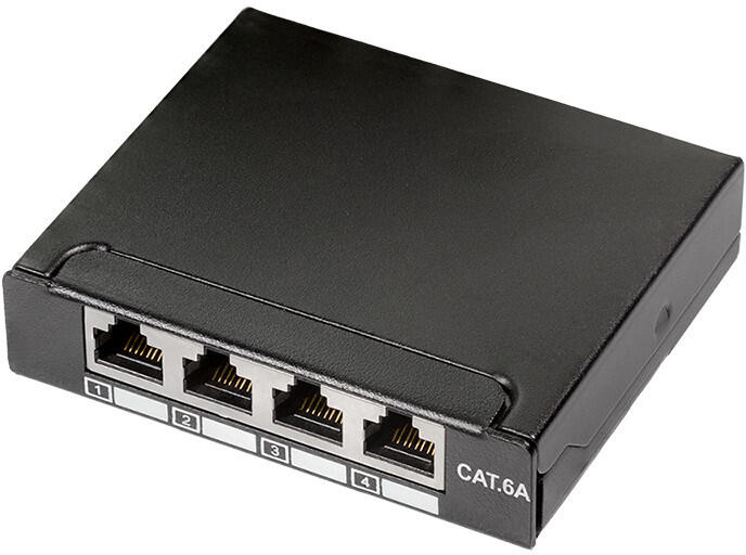 Cat. 6A az ISO/IEC 11801 szerint Nagyon kicsi fémház 4 árnyékolt RJ45 port IDC csatlakozás 22 26 AWG kerek kábelhez Falra szerelés vagy asztali telepítés Alkalmas DIN sínre szereléshez, MP0049 szükséges Szín: Fekete Gyártó: Logilink